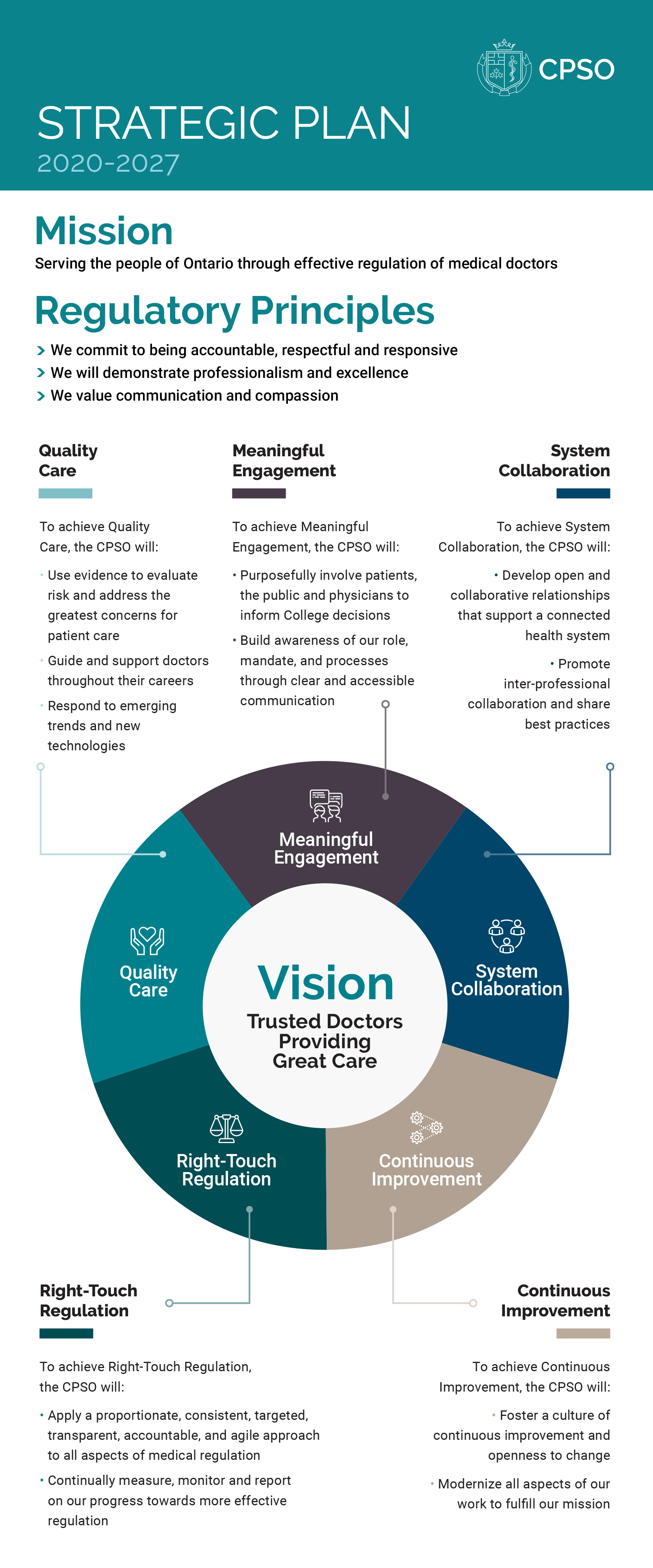 Informed and inspired by feedback from the profession and the public, CPSO’s Strategic Plan includes our mission, vision, strategic priorities and regulatory principles.